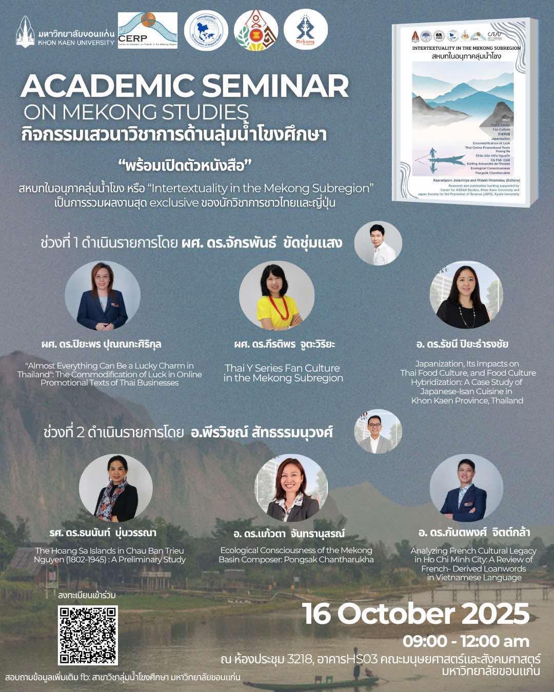 ศูนย์อาเซียนศึกษา มข. และศูนย์วิจัยพหุลักษณ์สังคมลุ่มน้ำโขง มข. ร่วมกับสาขาวิชาลุ่มน้ำโขงศึกษา คณะมนุษยศาสตร์และสังคมศาสตร์ มข. ชวนเชิญร่วมงานเสวนาวิชาการด้านลุ่มน้ำโขงศึกษา เปิดตัวหนังสือ “Intertextuality in the Mekong Subregion หรือ สหบทในอนุภาคลุ่มน้ำโขง”
