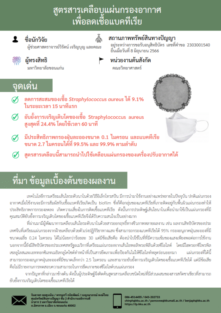 สูตรสารเคลือบแผ่นกรองอากาศเพื่อลดเชื้อแบคทีเรีย