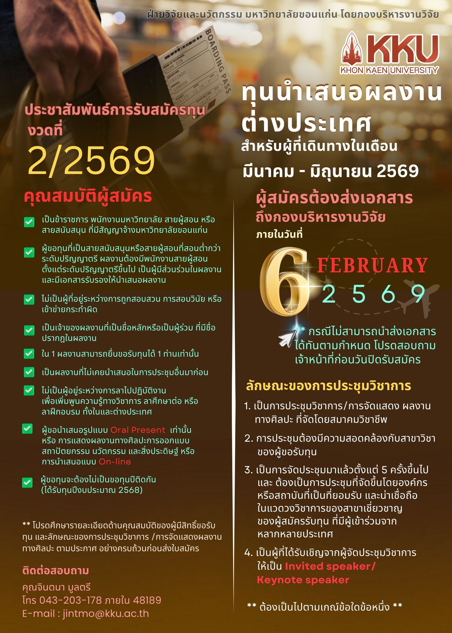 ฝ่ายวิจัยและนวัตกรรม มหาวิทยาลัยขอนแก่น เปิดรับข้อเสนอขอรับทุนสนับสนุนค่าใช้จ่ายในการนำเสนอผลงานทางวิชาการในต่างประเทศ (งวดที่ 2/2569) สำหรับอาจารย์ บุคลากรของมหาวิทยาลัยขอนแก่นที่มีคุณสมบัติตามเกณฑ์ในประกาศ