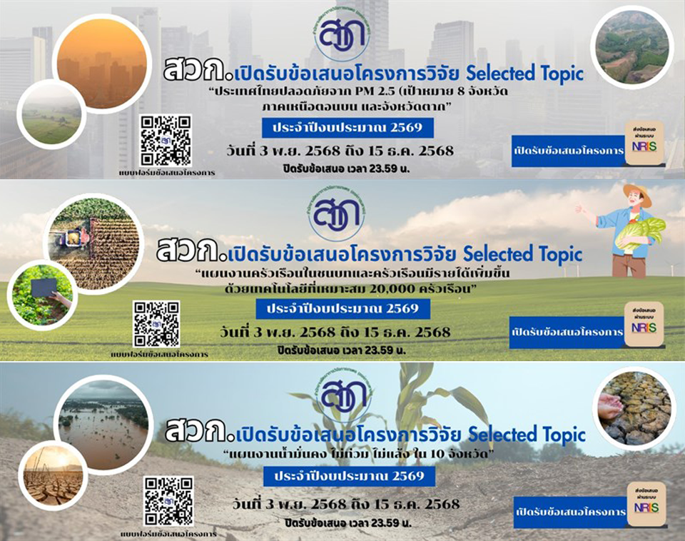 สำนักงานพัฒนาการวิจัยการเกษตร (องค์การมหาชน) ประกาศรับข้อเสนอโครงการวิจัย Selected Topic ประจำปีงบประมาณ 2569 ภายใต้หัวข้อวิจัย 3 เรื่องได้แก่