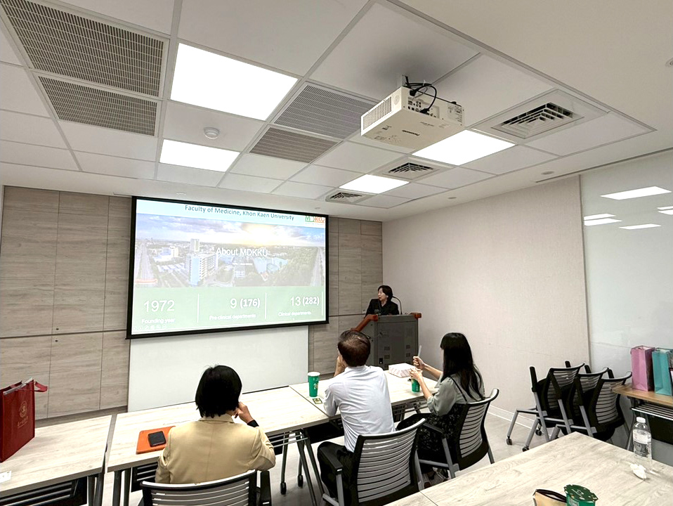 On December 2, 2025, the visit commenced at Taipei Medical University (TMU), where the KKU delegation held discussions with genomics researchers to exchange knowledge and develop collaborative plans for advanced multi-omics research on hepatocellular carcinoma. Professor Pewpan Maleewong, MD, Vice President for Research and Innovation, and Professor Sirirat Anutrakulchai, Vice Dean for Research and Innovation, Faculty of Medicine, presented an overview of Khon Kaen University and its health research capacities. Key research topics presented during the meeting included: