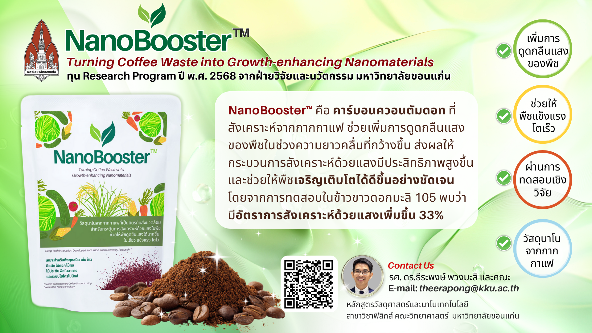 NanoBooster™ คือ คาร์บอนควอนตัมดอท ที่สังเคราะห์จากกากกาแฟ ช่วยเพิ่มการดูดกลืนแสงของพืชในช่วงความยาวคลื่นที่กว้างขึ้น ส่งผลให้กระบวนการสังเคราะห์ด้วยแสงมีประสิทธิภาพสูงขึ้น และช่วยให้พืชเจริญเติบโตได้ดีขึ้นอย่างชัดเจน โดยจากการทดสอบในข้าวขาวดอกมะลิ 105 พบว่ามีอัตราการสังเคราะห์ด้วยแสงเพิ่มขึ้น 33%