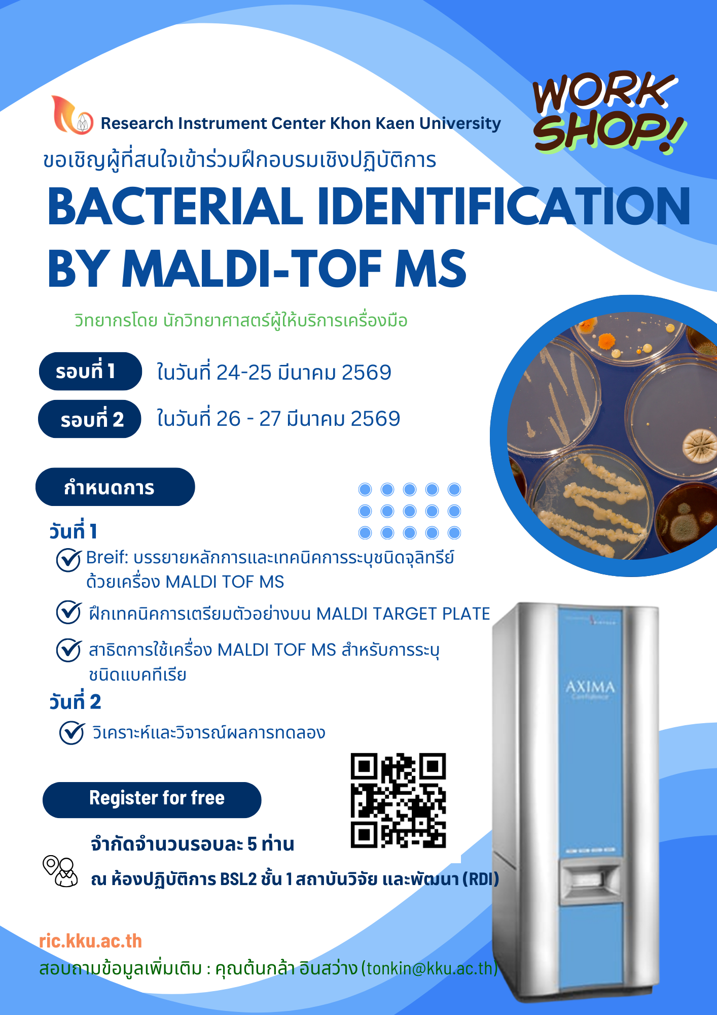 ศูนย์เครื่องมือวิจัย มข. (RICKKU) ขอเชิญร่วมเวิร์กชอปเชิงปฏิบัติ การแบบ Exclusive เจาะลึกเทคนิคการระบุชนิดแบคที เรียด้วยเครื่อง MALDI-TOF MS