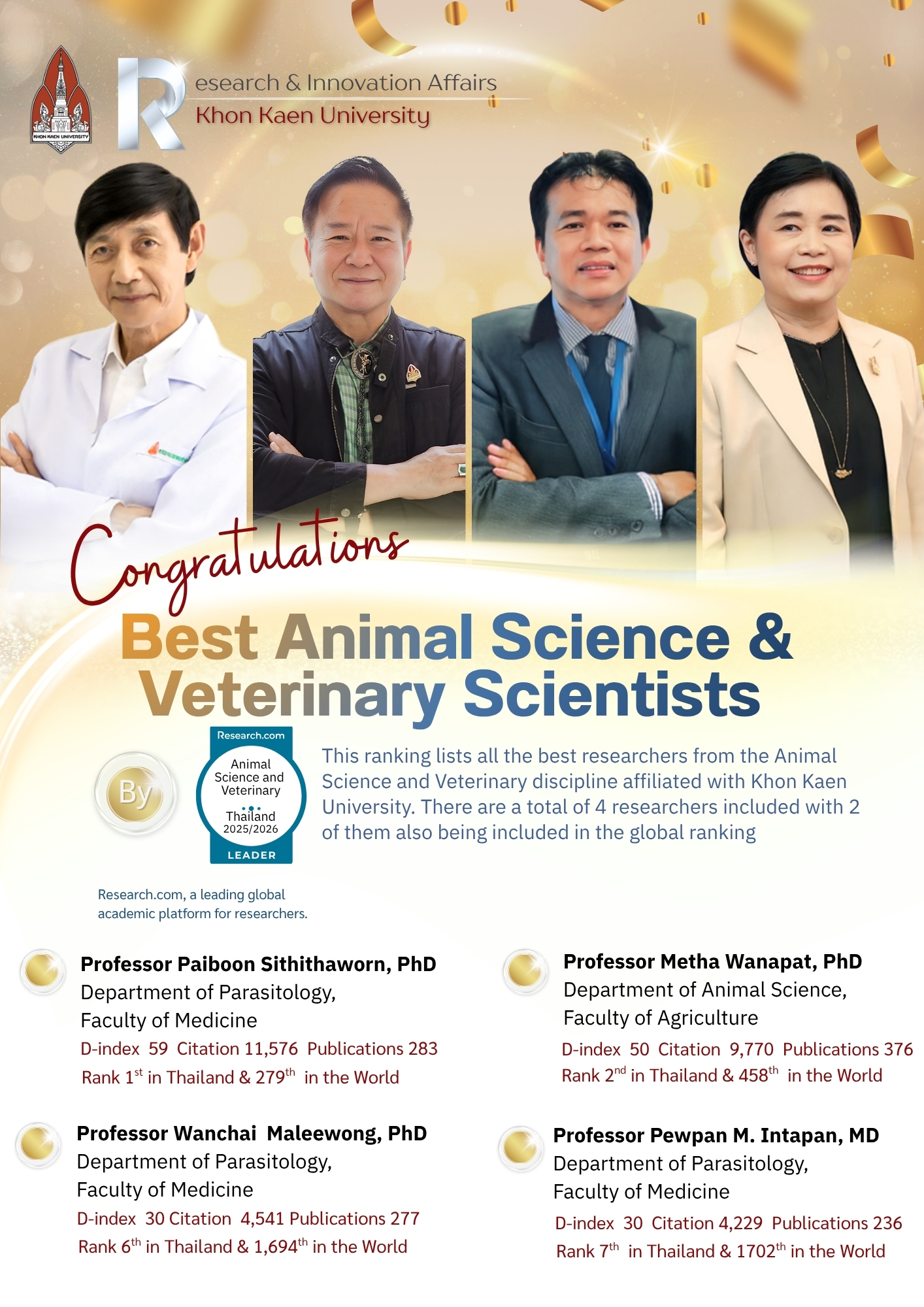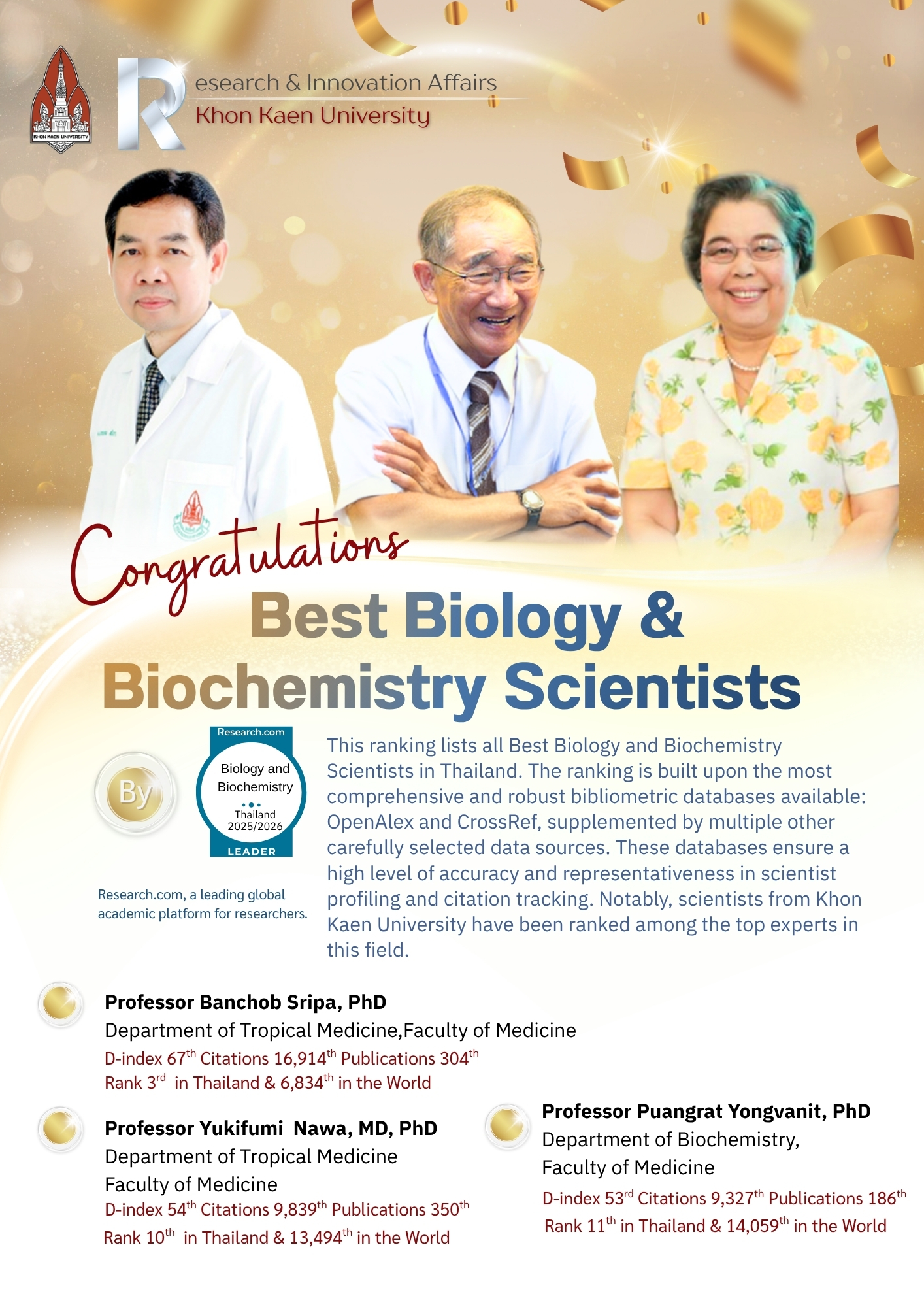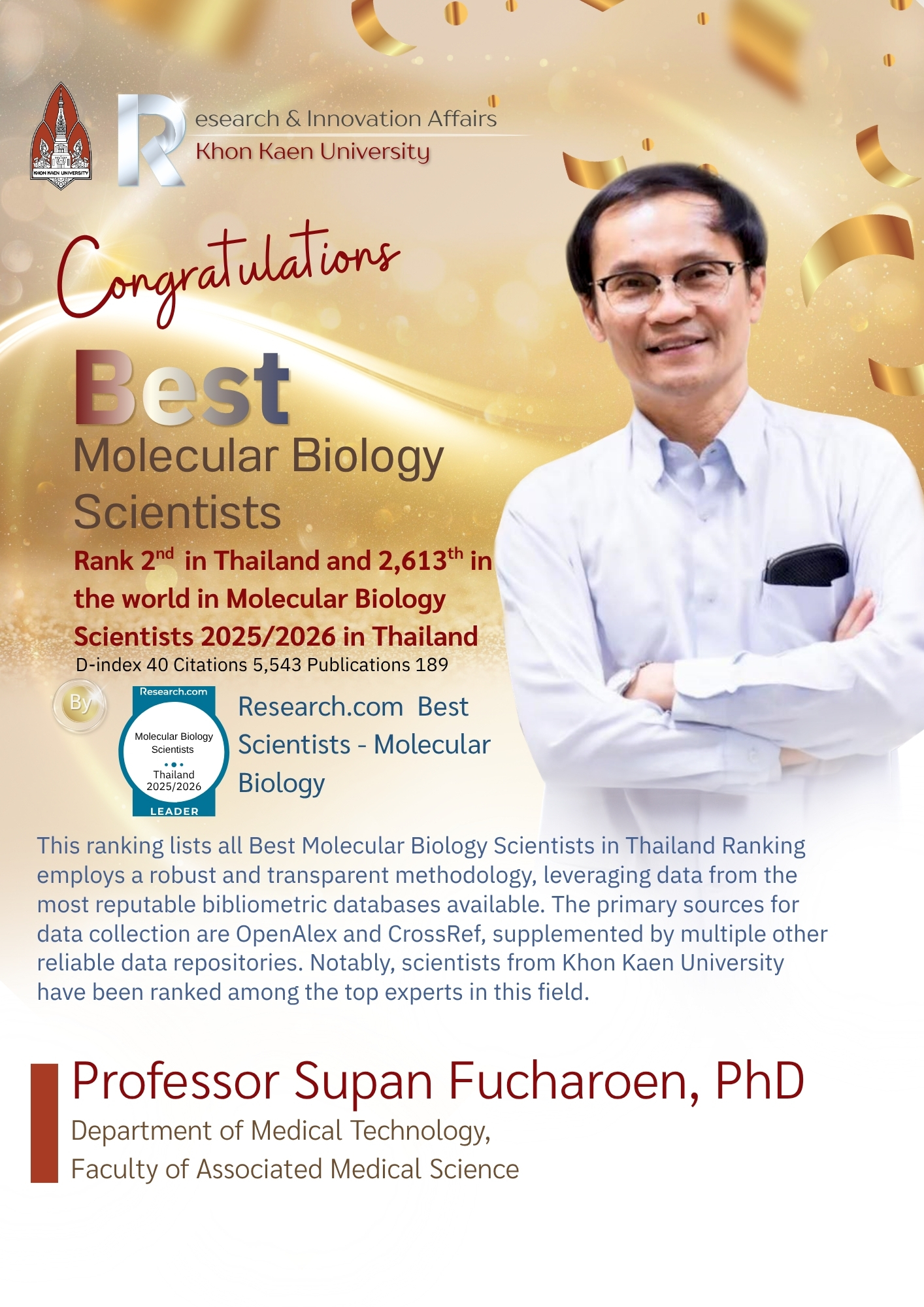 The Research and Innovation Affairs of Khon Kaen University hereby extends its highest commendation and congratulations to researchers of Khon Kaen University who have been recognized in the Research.com rankings for the year 2026. The key details are as follows: ฝ่ายวิจัยและนวัตกรรม มหาวิทยาลัยขอนแก่น ขอร่วมแสดงความยินดีกับนักวิจัยที่ได้รับการจัดอันดับจาก Research.com ประจำปี 2026 โดยมีรายละเอียดสำคัญดังนี้