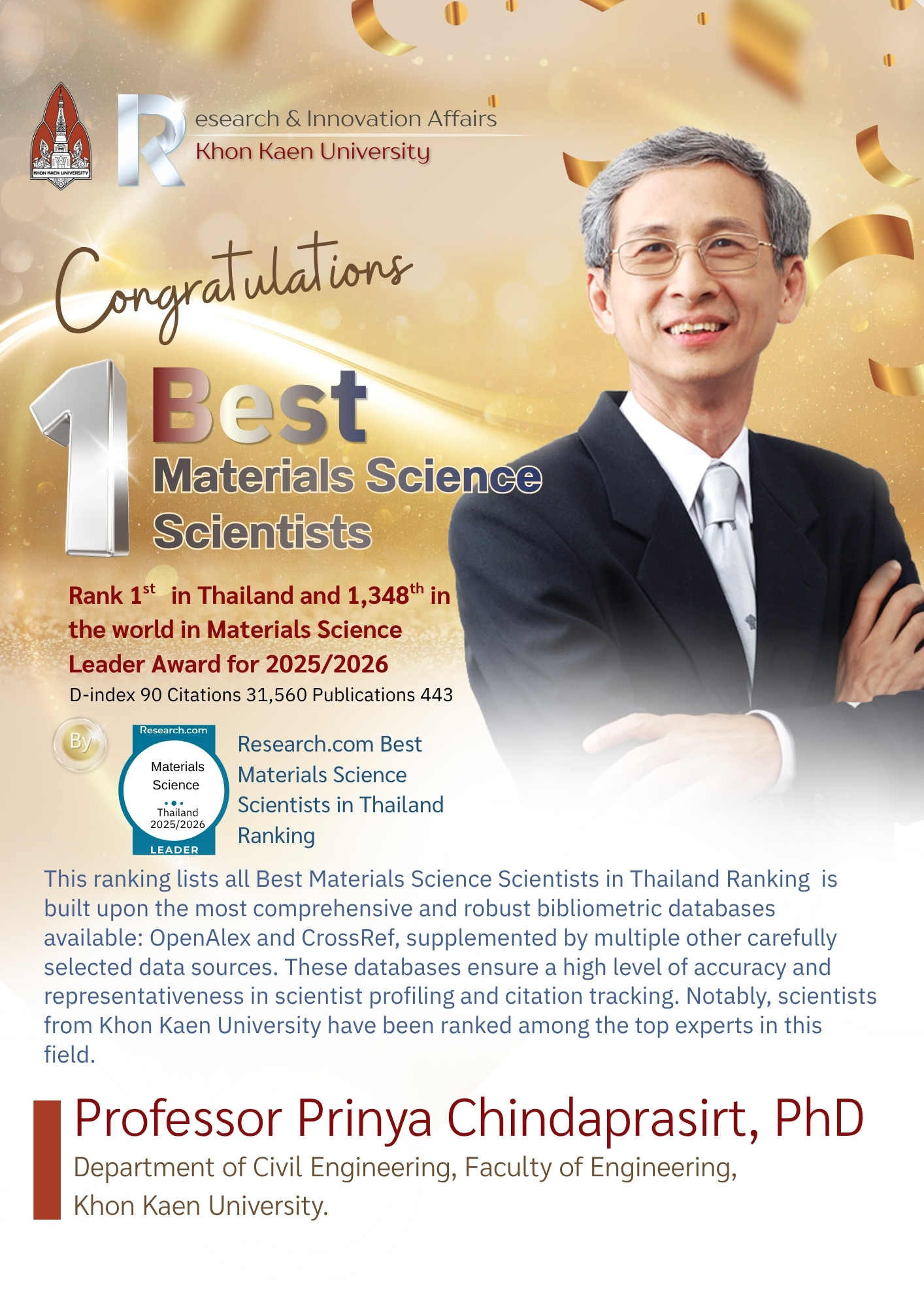 • Professor Prinya Chindaprasirt, PhD: Ranked 1st in Thailand and 1,348th globally (D-index 90), with 31,560 citations and 443 publications.