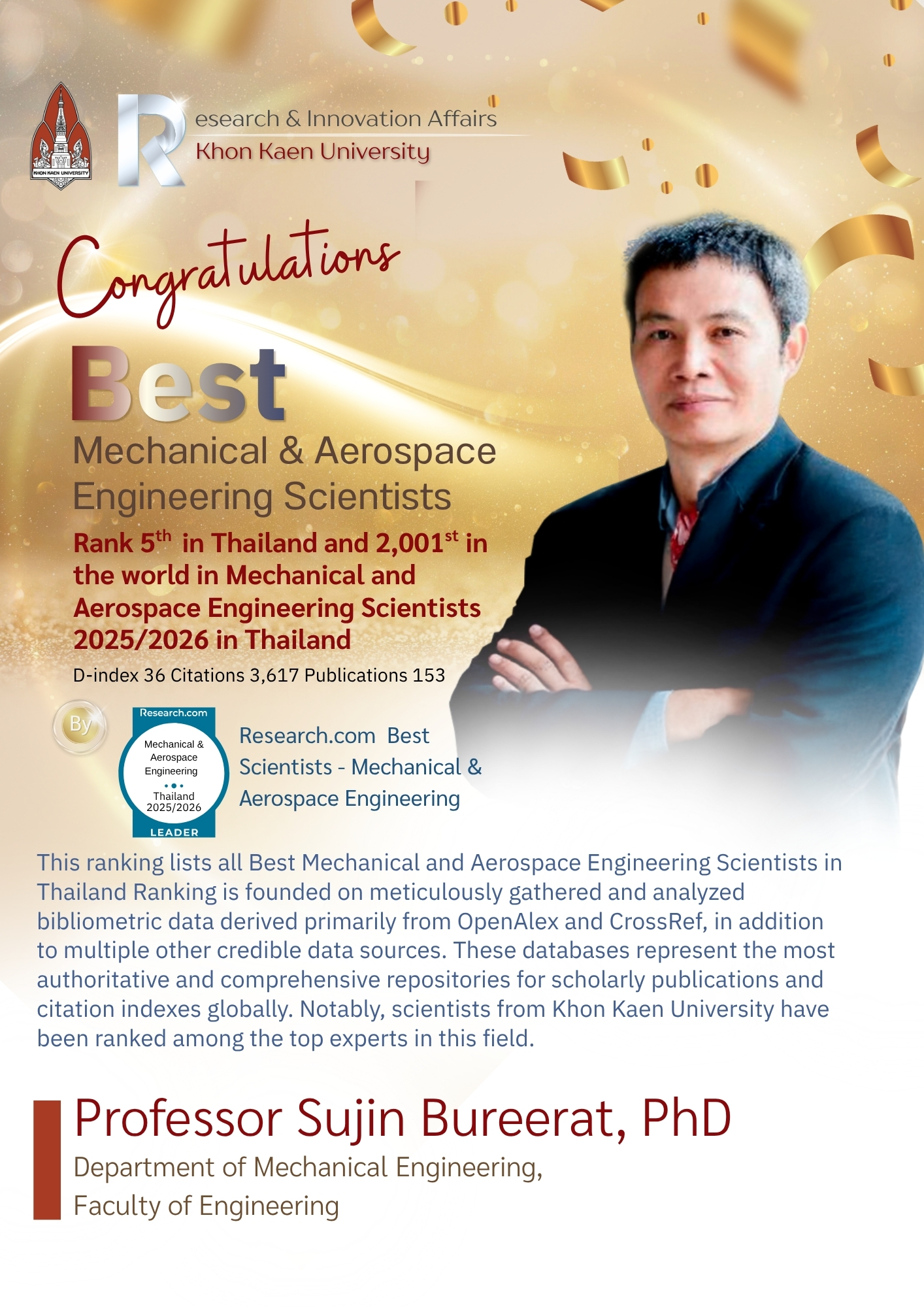 • Professor Sujin Bureerat, PhD: Ranked 5th in Thailand and 2,001st globally (D-index 36), with 3,617 citations and 153 publications