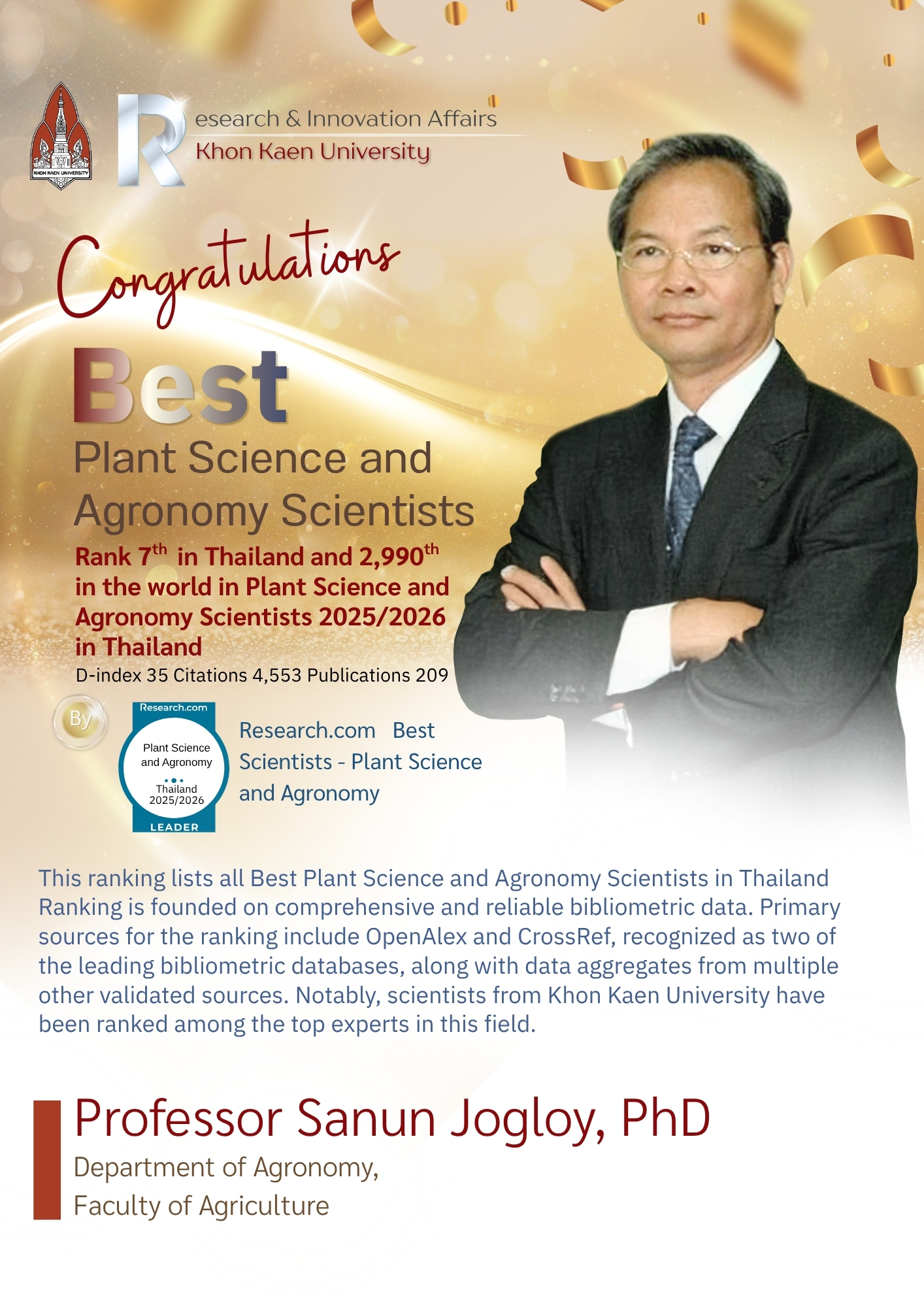 • Professor Sanun Jogloy, PhD: Ranked 7th in Thailand and 2,990th globally (D-index 35), with 4,553 citations and 209 publications.