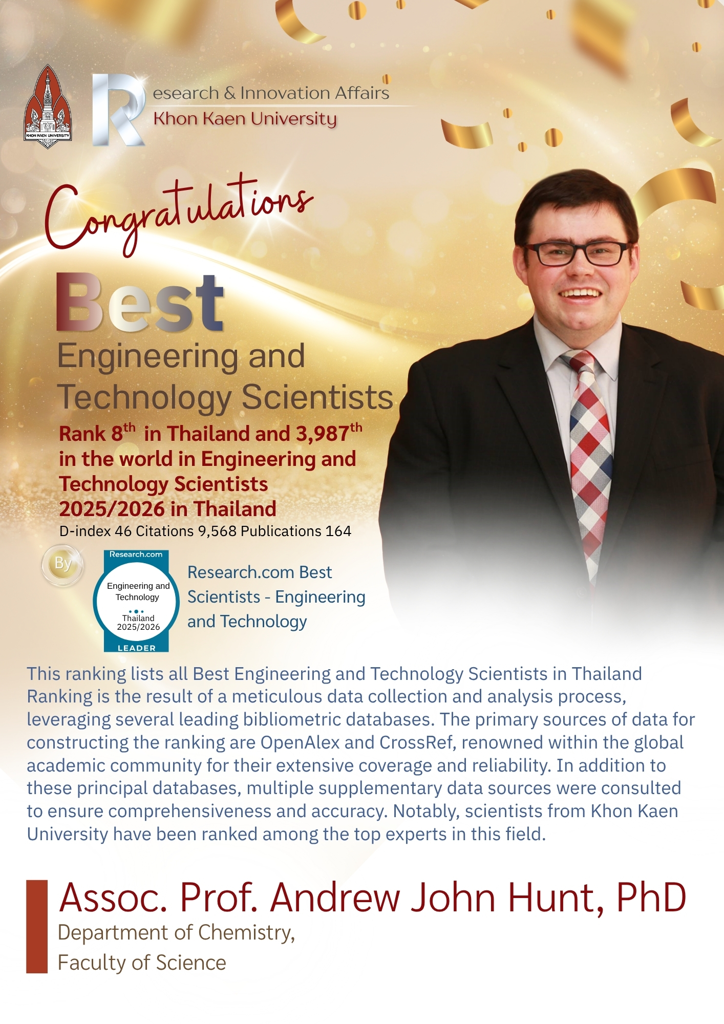 Prof. Dr. Andrew John Hunt อันดับ 8 ของประเทศไทย อันดับ 3,987 ของโลก (D-index 46) อ้างอิง 9,568 ครั้ง ผลงาน 164 เรื่อง