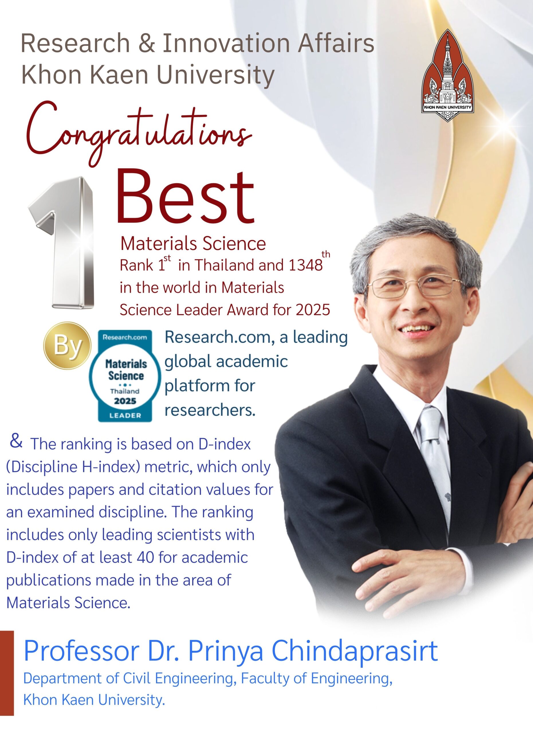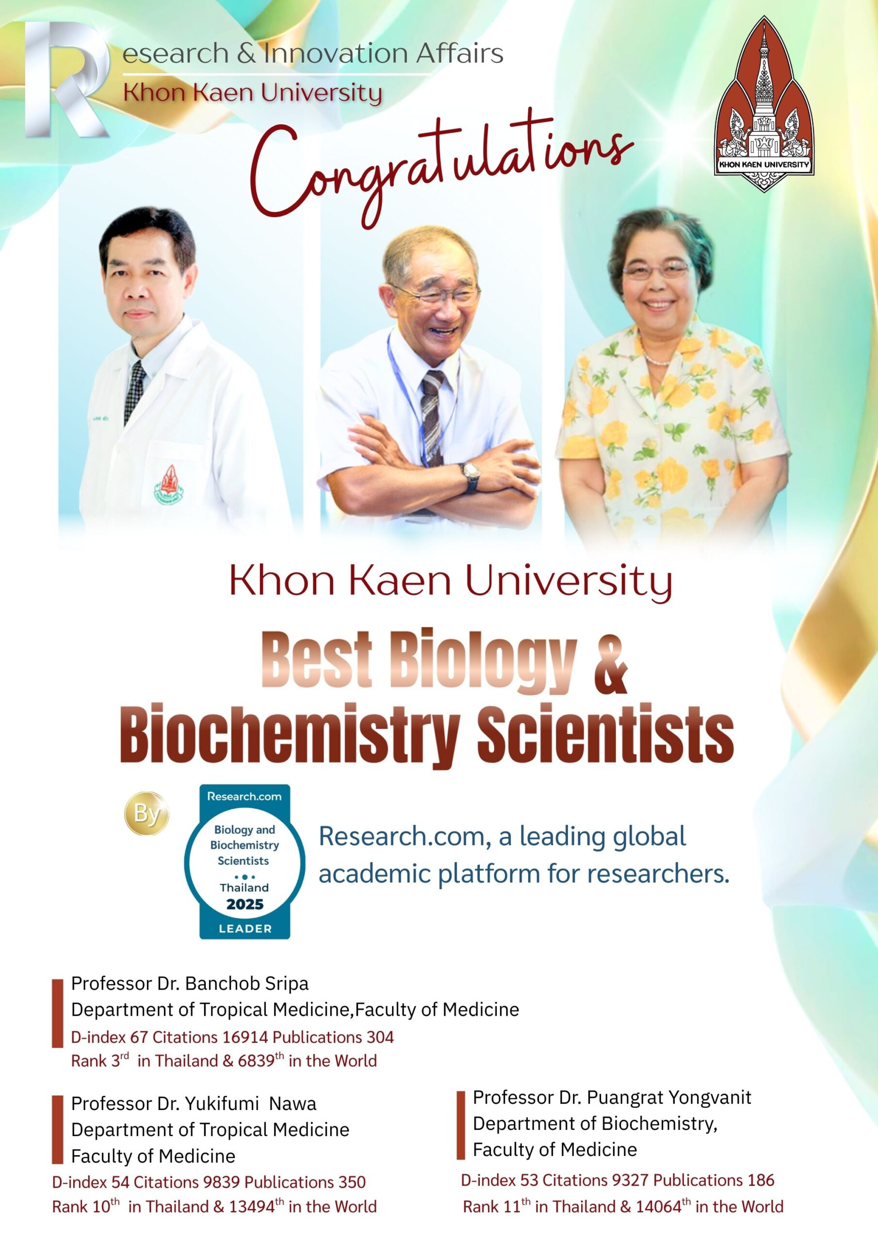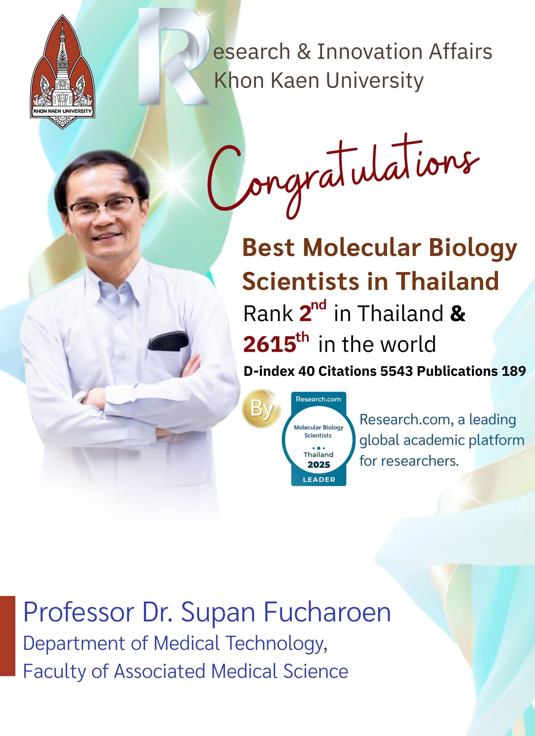The Research and Innovation Affairs at Khon Kaen University congratulates researchers who have been recognized in both global and national rankings for the year 2025, as evaluated by Research.com, a leading global academic platform for research and academic excellence across various disciplines. These rankings cover both individual researchers and university standings, in which Khon Kaen University has also seen improved positions. The details are as follows: