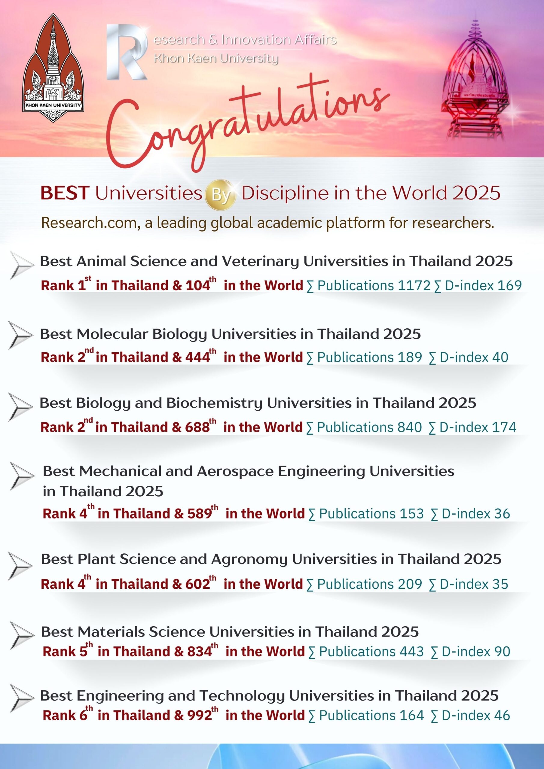 A global academic platform, Research.com, has ranked Khon Kaen University in the following disciplines: