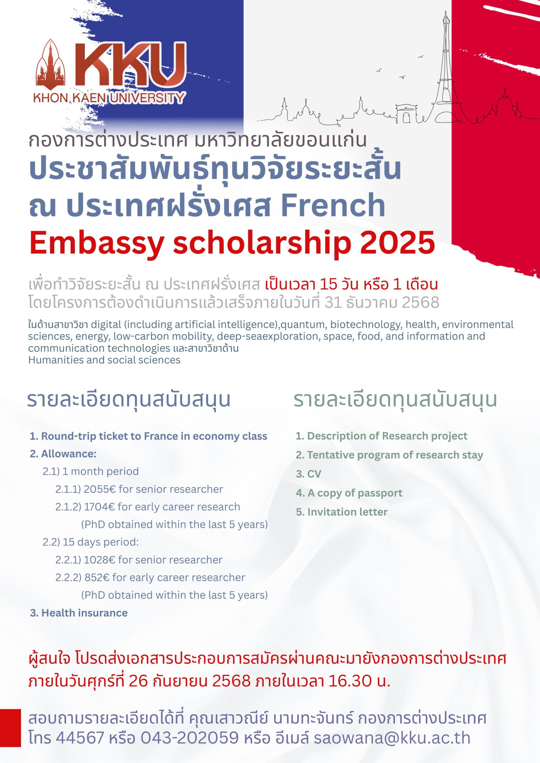 กองการต่างประเทศ มหาวิทยาลัยขอนแก่น มีความยินดีขอเรียนเชิญคณาจารย์และนักวิจัยในสังกัดมหาวิทยาลัยขอนแก่น ร่วมสมัครรับทุนสนับสนุนการทำวิจัยระยะสั้น ภายใต้โครงการ “French Embassy Scholarship 2025” เพื่อเปิดโอกาสในการสร้างเครือข่ายและพัฒนาความร่วมมือทางวิชาการกับสถาบันชั้นนำ ณ ประเทศฝรั่งเศส