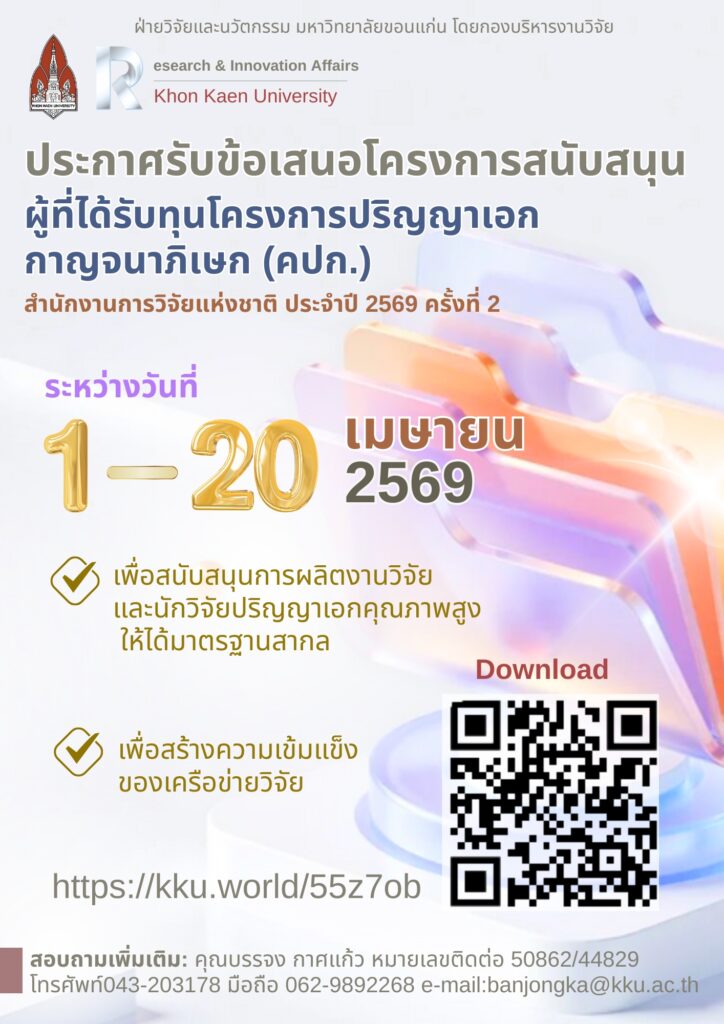 🗓 เปิดรับข้อเสนอระหว่างวันที่ 📌 วันที่ 1 – 20 เมษายน 2569 🎯 คุณสมบัติสำคัญ👨🏫 อาจารย์ที่ปรึกษาหลัก มข.🎓 มีนักศึกษาปริญญาเอกในโครงการ🌍 งานวิจัยมีศักยภาพตีพิมพ์ระดับนานาชาติ (Scopus/ISI) 🔗 ดูรายละเอียด / ดาวน์โหลดเอกสาร >>https://rad.kku.ac.th/00000_fund/phd.php 📞 สอบถามเพิ่มเติม ☎️ 043-203178 | 📱 062-9892268 📧 […]