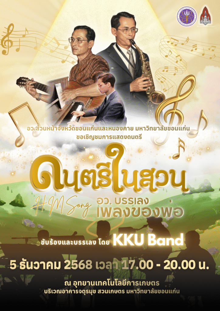 ขอเชิญร่วมรับฟังและรับชมการแสดง “ดนตรีในสวน H.M. Song อว. บรรเลงเพลงของพ่อ” อว.ส่วนหน้าจังหวัดขอนแก่นและหนองคาย ขอเชิญบุคลากร นักศึกษา และประชาชนทั่วไป ร่วมสัมผัสบรรยากาศกิจกรรมดนตรีกลางสวนอันอบอุ่นและงดงาม ในงาน “ดนตรีในสวน : อว. บรรเลงเพลงของพ่อ (HM Song)” พร้อมการขับร้องและบรรเลงโดย KKU Band ซึ่งคัดสรรบทเพลงพระราชนิพนธ์และบทเพลงพิเศษ เพื่อน้อมรำลึกในพระมหากรุณาธิคุณและเทิดพระเกียรติ 5 ธันวาคม 2568 เนื่องในวันคล้ายวันพระบรมราชสมภพ พระบาทสมเด็จพระบรมชนกาธิเบศร มหาภูมิพลอดุลยเดชมหาราช บรมนาถบพิตร ผ่านบทเพลงพระราชนิพนธ์ที่งดงามเหนือกาลเวลา […]