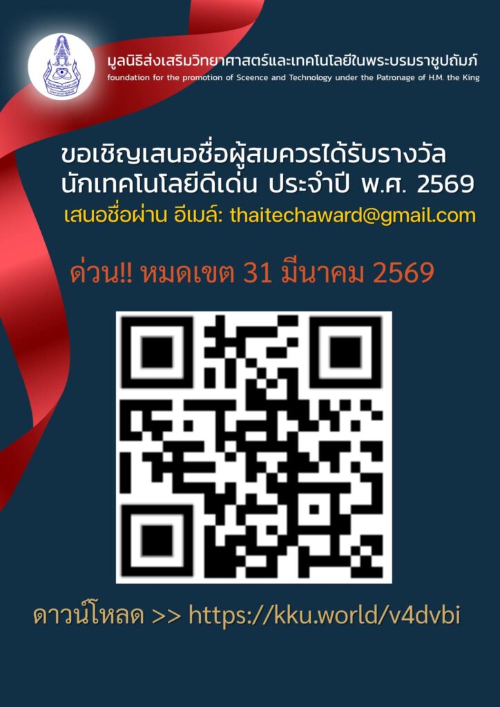 เชิญชวนเสนอชื่อเข้ารับ “รางวัลนักเทคโนโลยีดีเด่น และรางวัลนักเทคโนโลยีรุ่นใหม่” ประจำปี พ.ศ. 2568มูลนิธิส่งเสริมวิทยาศาสตร์และเทคโนโลยีในพระบรมราชูปถัมภ์ ขอเชิญชวนผู้มีผลงานด้านเทคโนโลยีและนวัตกรรม เข้าร่วมเสนอชื่อเข้ารับ รางวัลนักเทคโนโลยีดีเด่น และ รางวัลนักเทคโนโลยีรุ่นใหม่ ประจำปี พ.ศ. 2568 เพื่อเชิดชูเกียรติบุคคลหรือทีมที่มีผลงานวิจัยและพัฒนาเทคโนโลยีที่สามารถนำไปใช้ประโยชน์เชิงอุตสาหกรรมและเชิงพาณิชย์อย่างแท้จริง โดยมีวัตถุประสงค์ของโครงการรางวัลนี้จัดตั้งขึ้นเพื่อ: ยกย่องและเชิดชูนักเทคโนโลยีที่มีผลงานโดดเด่นและต่อเนื่อง ส่งเสริมการพัฒนาเทคโนโลยีให้ตอบโจทย์ความต้องการของภาคอุตสาหกรรมและชุมชน สร้างแรงจูงใจให้เกิดการพัฒนาเทคโนโลยีที่ยกระดับศักยภาพการแข่งขันของประเทศในเวทีโลก ประเภทของรางวัล รางวัลนักเทคโนโลยีดีเด่นเงินรางวัลรวม 1,000,000 บาท (ไม่เกิน 2 รางวัลต่อปี) พร้อม โล่รางวัลพระราชทานประติมากรรม “เรือใบซูเปอร์มด” รางวัลนักเทคโนโลยีรุ่นใหม่เงินรางวัล […]