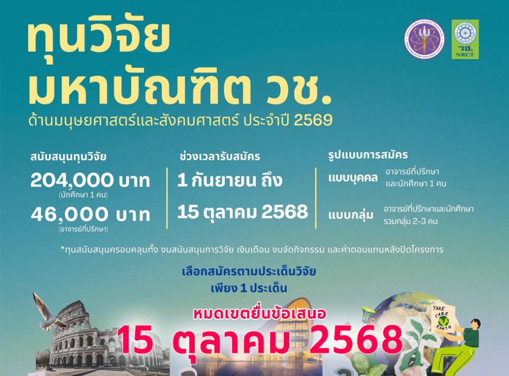 ประกาศรับข้อเสนอโครงการทุนวิจัยมหาบัณฑิต วช. ด้านมนุษยศาสตร์และสังคมศาสตร์ ประจำปีงบประมาณ 2569
