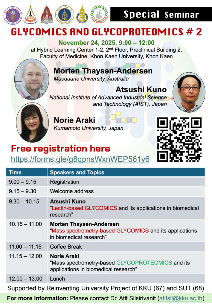 ขอเชิญเข้าร่วมสัมมนาพิเศษGlycomics and Glycoproteomics #2 วันที่ 24 พฤศจิกายน 2568 เวลา 09.00–12.00 น. ณ ห้อง Hybrid Learning Center 1–2 ชั้น 2 อาคาร Preclinical Building 2คณะแพทยศาสตร์ มหาวิทยาลัยขอนแก่น พบกับนักวิทยาศาสตร์ผู้เชี่ยวชาญจากญี่ปุ่นและออสเตรเลีย Dr. Atsushi Kuno – National Institute […]