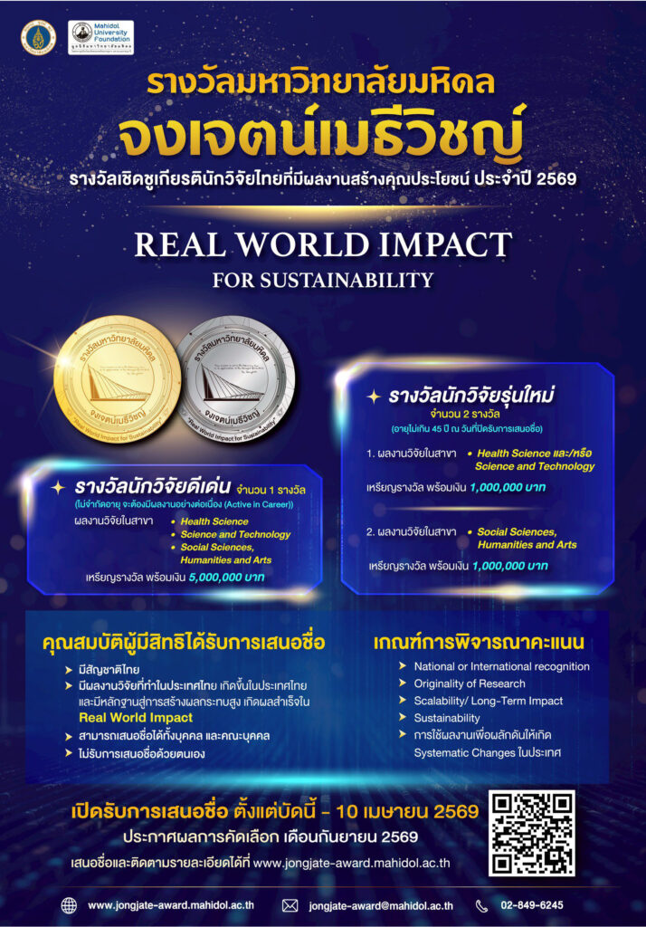 ขอเชิญเสนอชื่อนักวิจัยเพื่อรับรางวัล “มหาวิทยาลัยมหิดล จงเจตน์เมธีวิชญ์” ประจำปี 2569